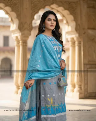 ঐতিহ্য এবং আধুনিকতার নিখুঁত মেলবন্ধন ঘটিয়ে টাঙ্গাইল শাড়িজ আপনাদের জন্য নিয়ে এসেছে এই বিশেষ থ্রি-পিস কালেকশন। আমাদের এই এক্সক্লুসিভ সেটে রয়েছে টাঙ্গাইলের সুপ্রাচীন বুননশিল্পের নিপুণ কারিগরি এবং সমসাময়িক ডিজাইনের এক অনবদ্য ছোঁয়া।