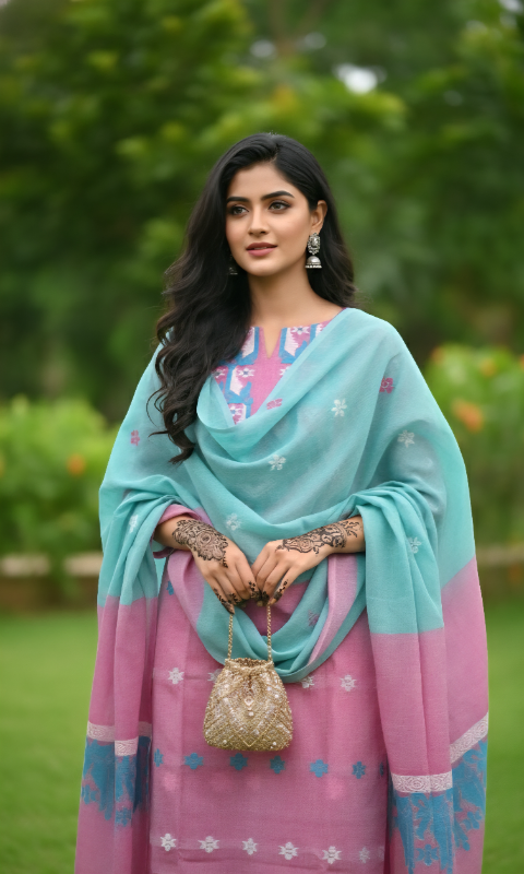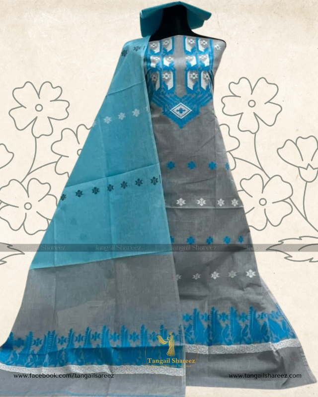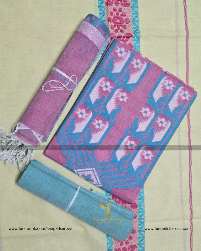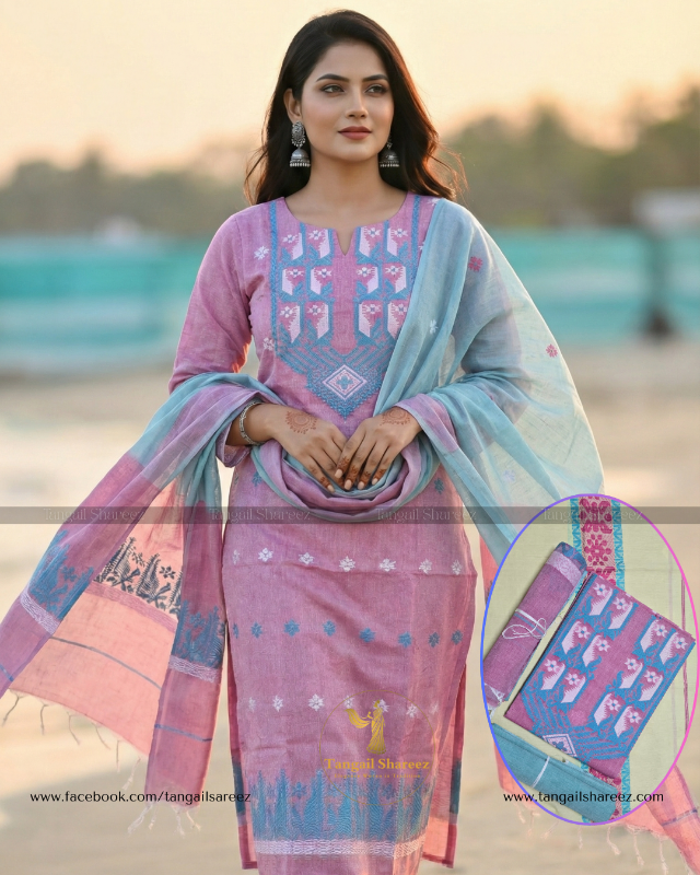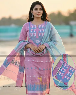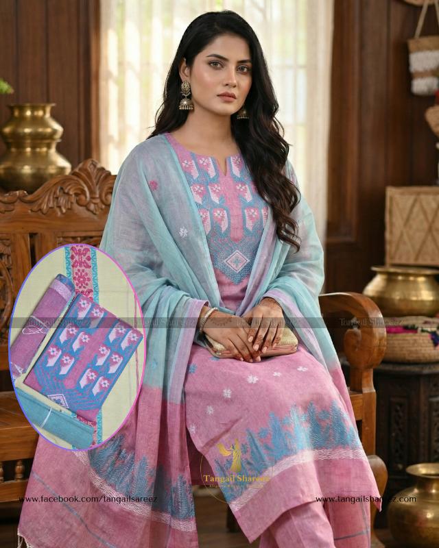 টাঙ্গাইলের ঐতিহ্যবাহী বুননে তৈরি এই মনোমুগ্ধকর থ্রি-পিস সেটটি আপনার সংগ্রহে আনুন।